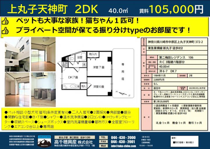 【 マンション 】【満室御礼】◎当社管理◎「ネコちゃんOK物件。新丸子8分・多摩川まで1分。自然環境◎の閑静な住宅街物件。」